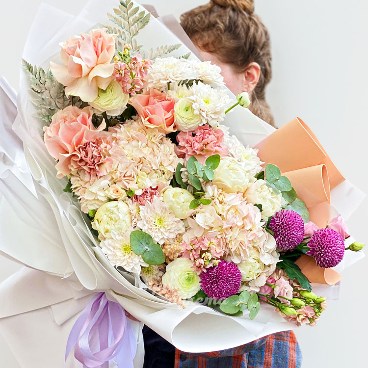 Большой букет гортензий, хризантем и роз
