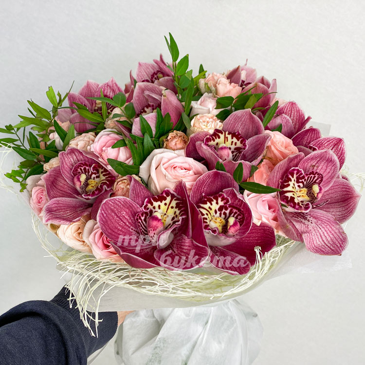 Букет бордовых орхидеи и персиковых роз