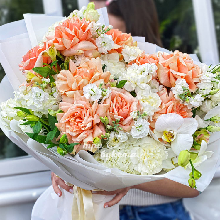 Букет гортензий, маттиол и персиковых роз