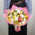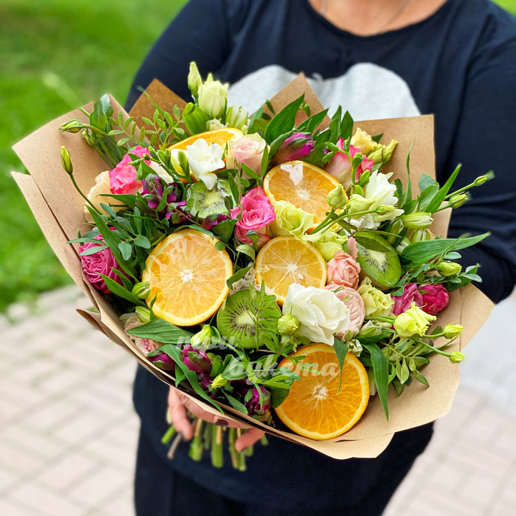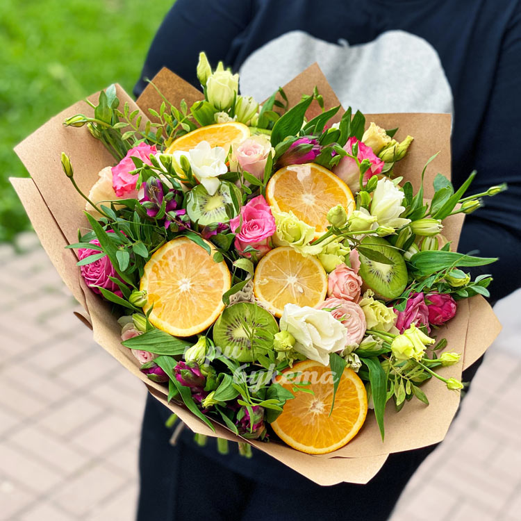 Букет из цветов и фруктов в крафте