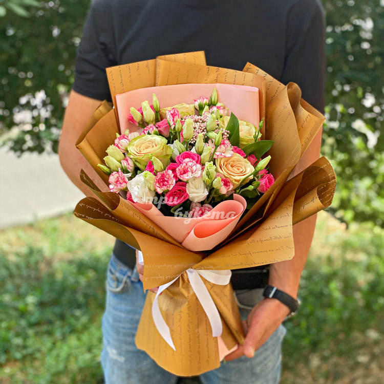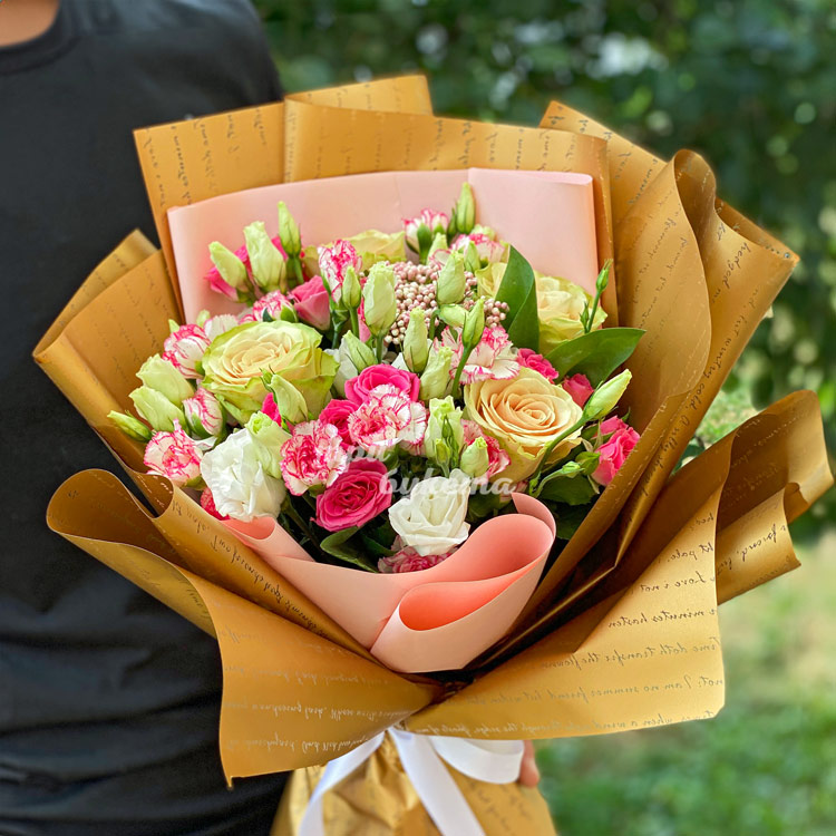 Букет розовых кустовых гвоздик и роз