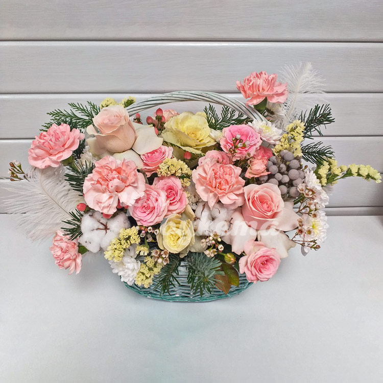 Композиция из роз, гвоздик и хлопка