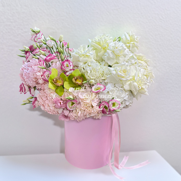 Коробка гортензий, эустом и французских роз