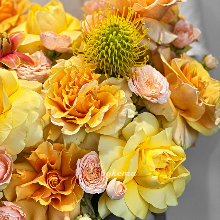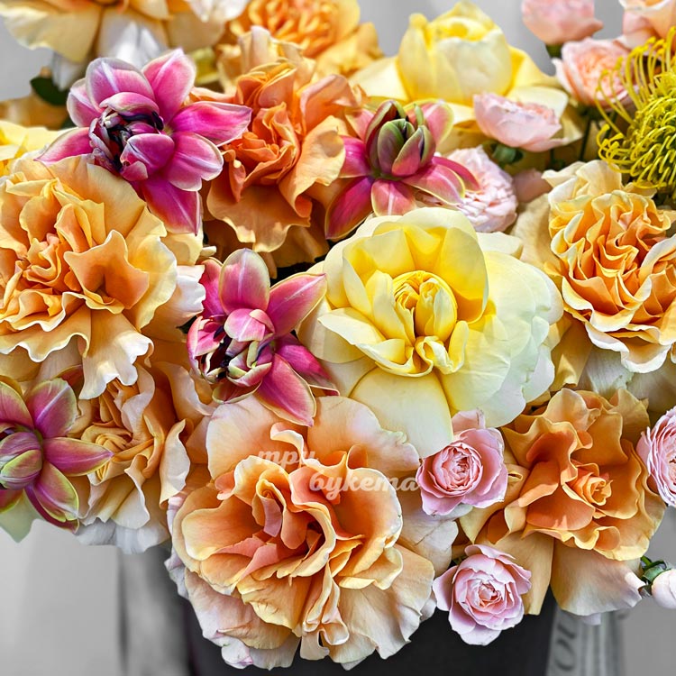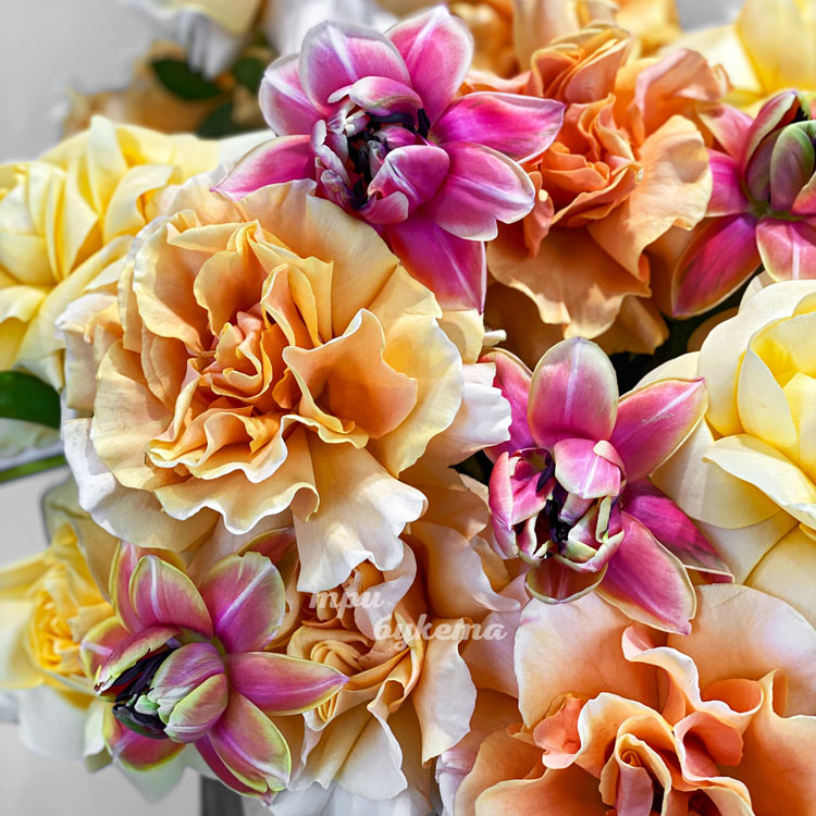 Коробка желтых французских роз с тюльпанами