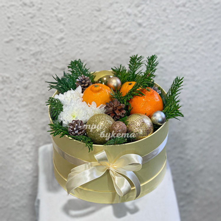 Новогодняя коробка с апельсинами и хризантемой