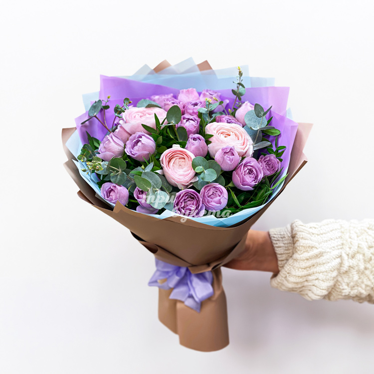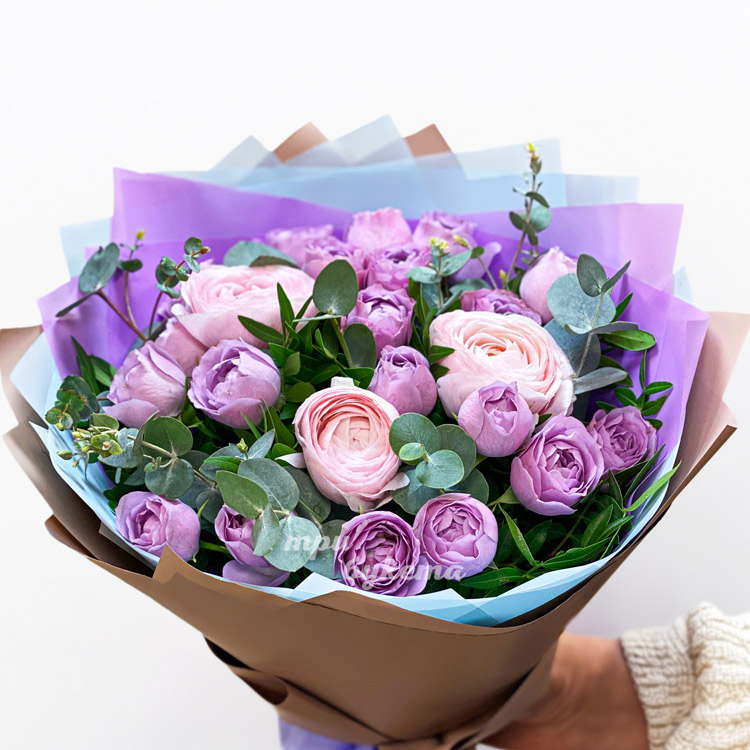 Сиреневые кустовые розы с ранункулюсами